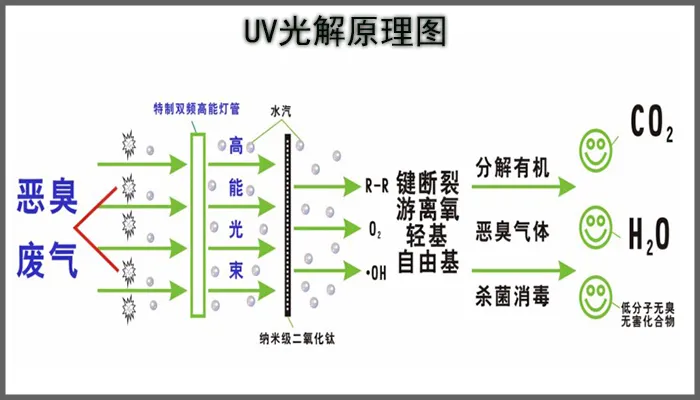 2、利用特制的高能UV紫外線光束照射惡臭氣體,裂解惡臭氣體的分子鍵,降解轉(zhuǎn)變?yōu)榈头肿踊瘜W物,如二氧化碳和水等物質(zhì)。