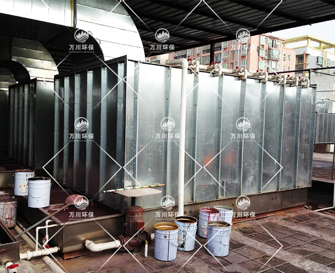 均勻安裝多層濕簾層和過濾層。水性過濾棉,不吸水,漆粉附著表面時,會隨水流受重力作用被洗滌至循環(huán)水池,不易堵。濕簾層經(jīng)水洗后會在面上形成一層水膜,漆粉經(jīng)過該層被水膜黏附,對降低氣體流速,加長廢氣在噴淋塔的洗滌時間有重要作用。廢氣經(jīng)過除霧層(即氣水分離)后,再進(jìn)行活性炭吸附塔吸附。該法具有處理效果高,運行穩(wěn)定優(yōu)點。